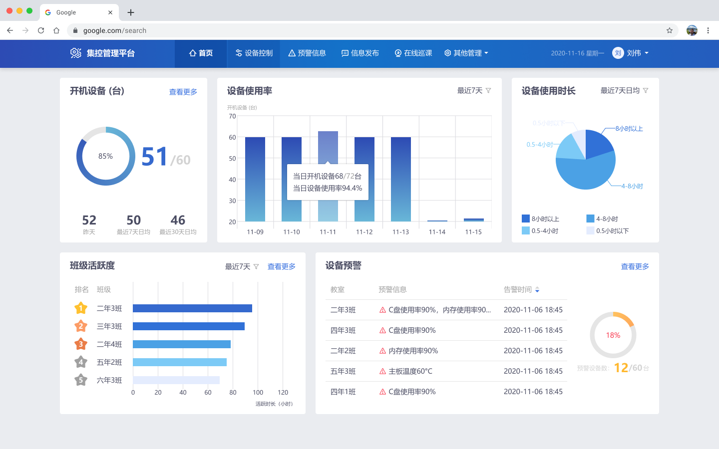 在尊龙时凯智慧黑板2.0集中控制管理平台上,负责教务管理的老师能够可视化监管所有网络内接入的教学设备,对设备使用时长、故障预警、班级活跃度等方面进行实时、规范掌握。当想具体了解某一间教室的上课情况时,也可以通过云端进行在线巡课,全心关注学生需求和教学质量反馈。以云平台管理替代人工巡检,无疑是教学管理效率提升的有力武器,也更为符合新时代教育改革的方向。