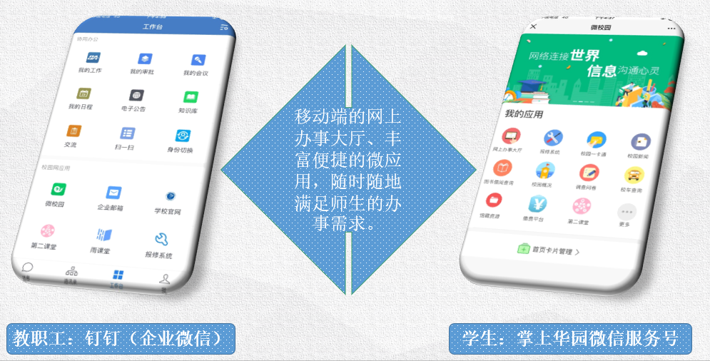 将“掌上华园”与钉钉、企业微信以及微信服务号打通,达到应用、消息的后台统一管理,真正实现一键将应用、消息同时发布到各个移动终端,为全体师生提供了工作、学习和生活等全方位移动化服务。