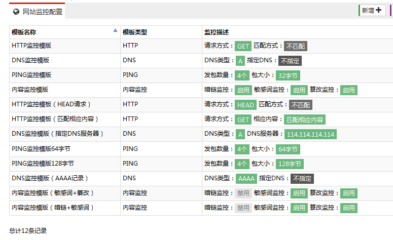 全线路探测的PING、DNS监控域名解析变动、HTTP GET、HEAD、关键字监控。