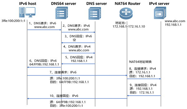 (1)IPv6主机发起到DNS64 server的IPv6域名解析请求(主机配置的DNS地址是DNS64),解析域名为www.abc.com;