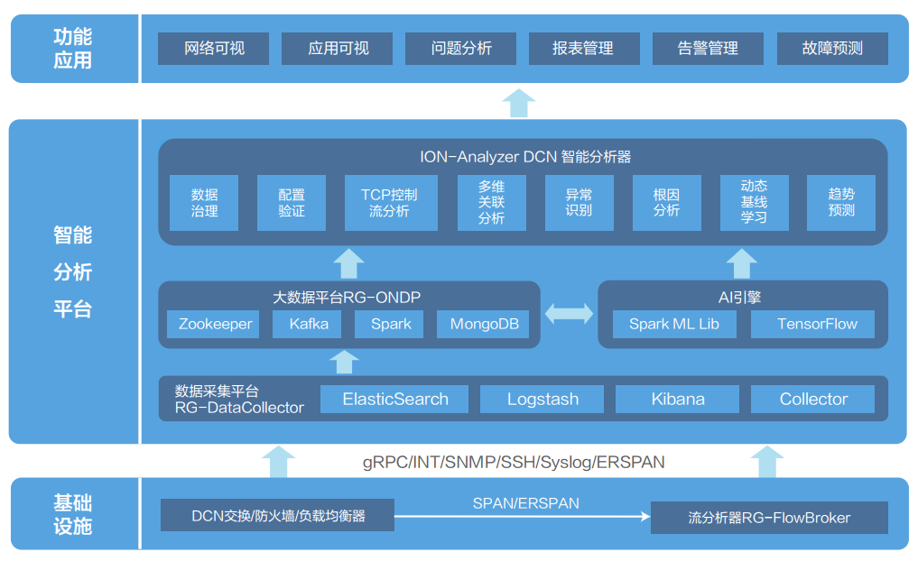 通过部署ERSPAN、INT、MOD+TCB等技术,结合IBN意图分析引擎实现网络端到端的可视化及智能运维,