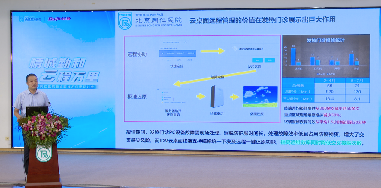 基于测试结果,同仁医院又进行了小规模部署测试,发现云桌面的远程管理功能对发热门诊作用很大。发热门诊如果出现终端故障,现场维修不仅变成高危工作,还要耗费医院的防护服物资。而支持远程运维的IDV避免了这些问题。