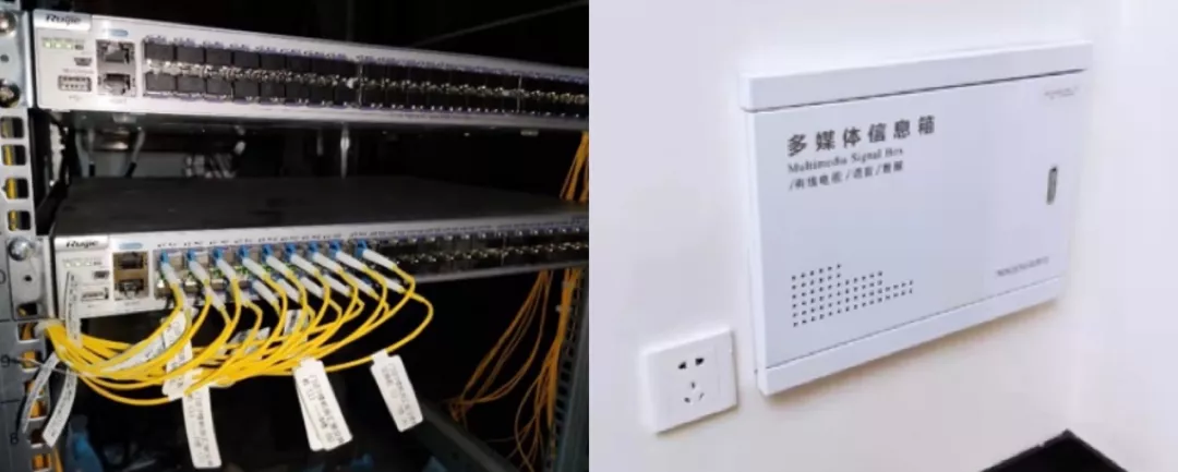 左:尊龙时凯全光汇聚交换机在楼宇汇聚机房 右:房间极简光交换机安装在多媒体箱内