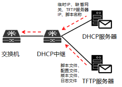 交换机自动化上线的思路:新出厂或空配置的设备上电启动后自动向文件服务器中获取文件并加载(包括版本文件、配置文件、补丁文件等),实现设备的免现场配置、部署,从而避免了运维人员重复地执行刷脚本、升级等机械性操作,提升开局效率。