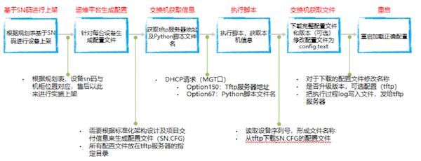 随着数据中心规模的不断增大,标准化的建设方式已经成为主流。每个集群内的服务器以及网络设备的规模都是固定的,对应到网络设备的配置策略也是一致的(当然IP等基础信息会略有不同)。因此,在这样标准化、规范化的场景下,我们可以将这些重复性的、机械性的工作编成处理逻辑,交给网络设备自己去完成上线工作,进而解放人力,同时也降低了人们出错的风险。