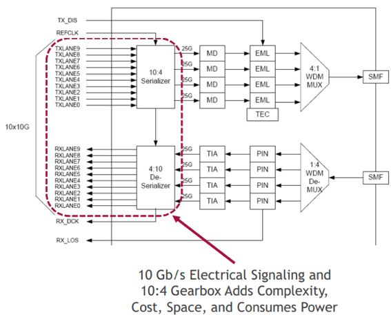 CFP最早被提出,短距传输应用100GBASE-SR10标准,长距传输应用100GBASE-LR4。第一代CFP长距传输方案如下,因为电接口能力只有CAUI-10,所以需要内置Gearbox(下图的10:4 Serializer)来实现10 x 10Gbps与4 x 25Gbps电信号的转换。后来随着电信号提升到CAUI-4,第二代CFP(CFP2/CFP4)长距传输方案中不需要内置Gearbox。