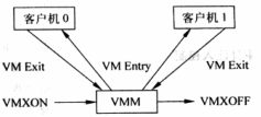 虚机在运行过程中不断地在GuestOS与HostOS之间切换,如图 2.1?3 VM entry和VM exit所示,从主机(VMM)到虚机称为VM Entry,从虚机切换到主机称为VM Exit。VMXON和VMXOFF是用来开启/退出VMX操作模式的指令。虚机中断模拟机制是在VM Entry的时候向虚机注入中断的信息。