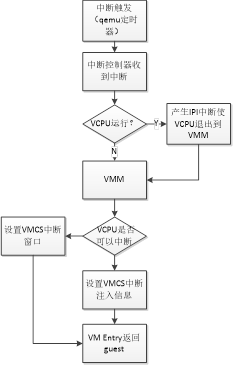 当模拟的时钟硬件产生中断后,就依据图 2.1?4 中断注入流程将中断注入到虚拟机中。首先将中断交给中断控制器,中断控制器根据中断的优先级将中断注入虚机,中断是通过vCPU从VMM切换到虚机运行环境时注入的。所以vCPU如果在运行中,就需要通过IPI来使得vCPU退出到VMM中。