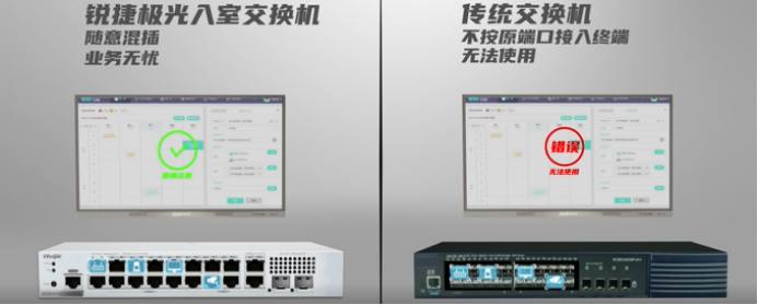 尊龙时凯RG-SF系列极简光交换机整个尺寸只有A4纸的三分之二大小,采用新一代的硬件架构,声音小,且支持网络开局和运维阶段设备即插即用,即便不是专业的运维人员也可以上手操作。