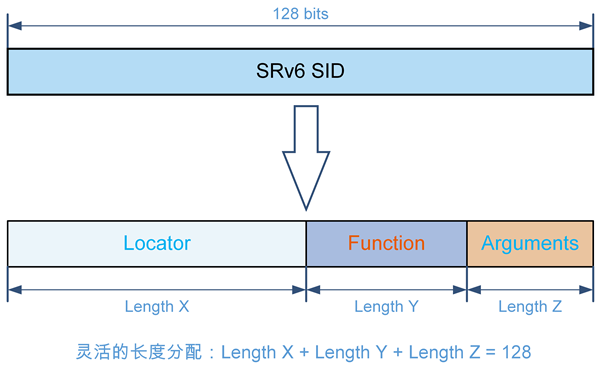 SRv6 SID用来区分路径分段。SRv6 SID是一个长度为128比特的值,其格式虽然和IPv6地址相同,但不同于传统意义上理解的IPv6地址。在SRv6网络中,IPv6地址被赋予了新的含义。SRv6 SID由Locator、Function和Arguments三个部分组成。其中Locator占据SRv6 SID的高比特位。