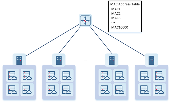随着虚拟化技术的应用,每个实体服务器上可能会运行大量虚拟机,因此二层网络中虚拟机MAC地址数量面临数量级的增长。为了不同二层网络间能够正常转发数据报文,接入交换机需要学习每一个二层网络中虚拟机的MAC地址。受限于硬件水平,接入交换机的MAC地址表容量一般较小,难以满足需求。