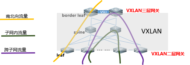 分布式VXLAN网络结构相对复杂,但东西和南北向在Leaf和Border Leaf间分流,均衡Leaf和Border Leaf的压力,适用于大规模数据中心。