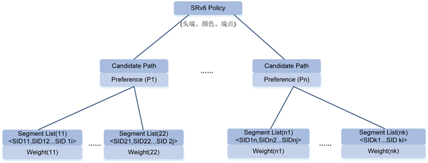 SRv6 Policy的模型如图1-1所示。一个SRv6 Policy至少包含一条候选路径(Candidate Path),候选路径携带优先级(Preference),SRv6 Policy会选择优先级最高的有效候选路径作为主路径。一个候选路径可以包含多个Segment List,每个Segment List都是一个显式SID栈,用于指示网络设备转发报文。每个Segment List携带Weight属性,同一候选路径下的多个Segment List之间可以依据Weight属性负载分担流量。