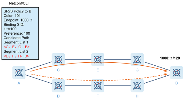 c     在头端设备A上配置SRv6 Policy,当设备A接收到BGP路由1000::/96后,由于路由的颜色101和SRv6 Policy的颜色101匹配,并且路由的下一跳1000::1和SRv6 Policy的目的地址(即端点)也匹配,故此路由可以导入SRv6 Policy。设备A将路由和关联的SRv6 Policy安装到FIB表。转发时,设备A为目的地址匹配1000::/96的报文添加一个具体的SID栈