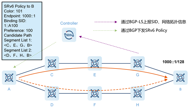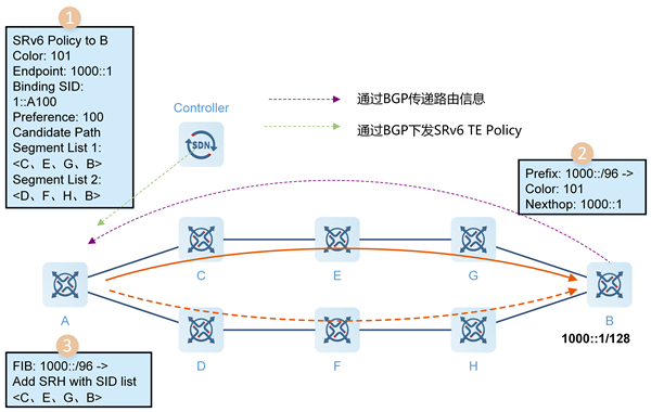 c     控制器计算SRv6 Policy,然后通过BGP邻居下发给头端。头端生成SRv6 Policy表项。