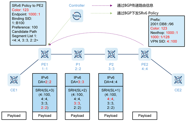 a     控制器通过BGP-LS下发SRv6 Policy给头端PE1设备。