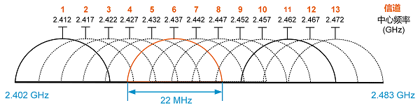如图3-2和图3-3所示,无线局域网标准协议将2.4GHz频段划分为13个相互交叠的信道,而5GHz频段的信道则更加独立。